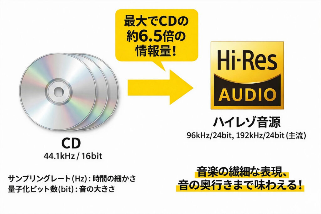 CDのフォーマット(規格)は44.1kHz / 16bitであり、ハイレゾ音源は96kHz/24bitや192kHz/24bitが主流であるため、最大でCDの約6.5倍の情報量をもっていることになります。