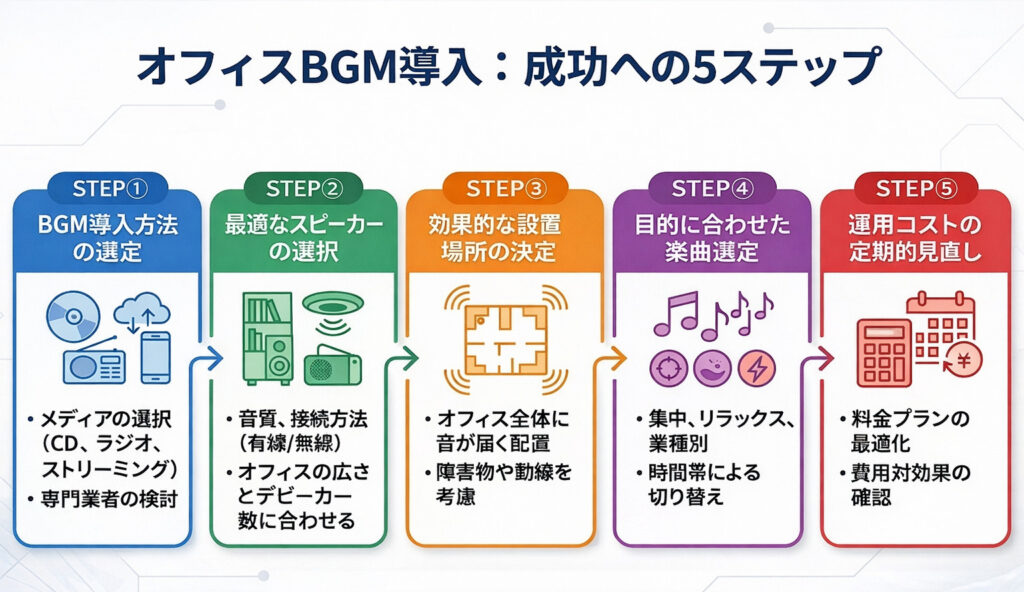 導入を前向きに検討していても、具体的なイメージがわいていなければ先送りにしてしまいやすいでしょう。こちら章では、オフィスに音楽を流す方法を、5ステップに分けて具体的にご紹介します。
