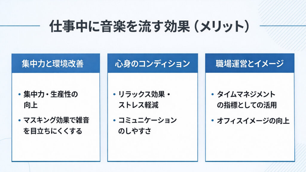 ここからは、職場でBGMを流すことで期待できる効果を整理していきます。BGMは一つの効果だけでなく、集中・回復・コミュニケーションといった複数の要素に同時に作用しやすいのが特徴です。