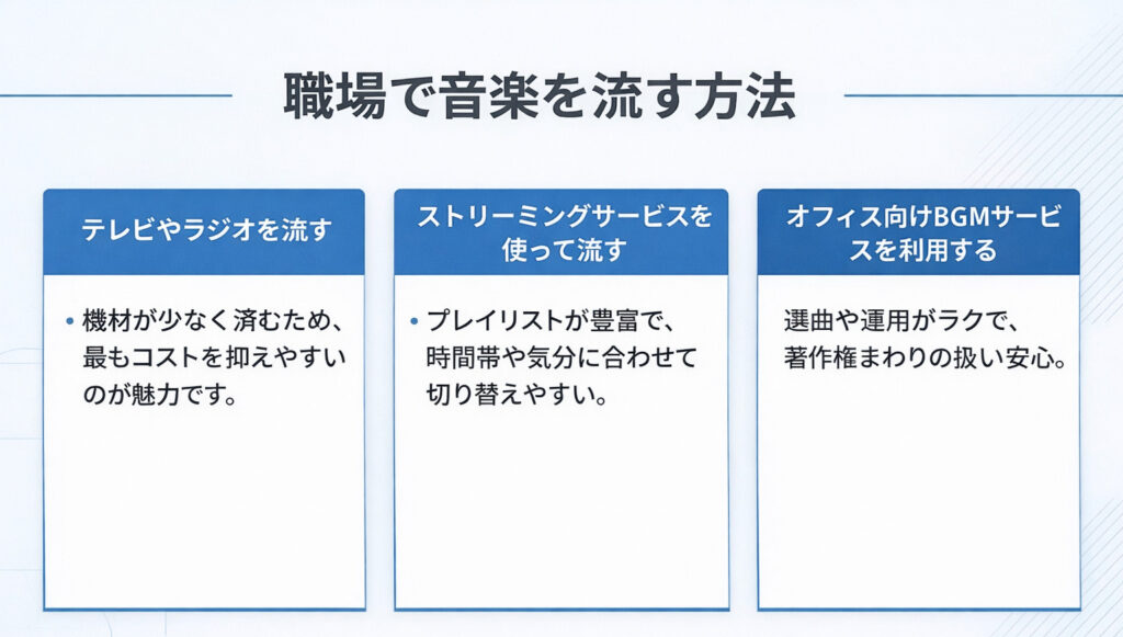 そこでこの章では、職場の規模や運用のしやすさに合わせて選べる、代表的な4つの方法をご紹介します。ポイントは、音源だけでなく再生方法と運用ルールまでセットで考えることです。